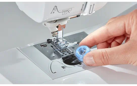 - Bobina ad inserimento rapido: è sufficiente infilare una bobina completa e inserire il filo nella direzione della freccia per essere pronti a cucire